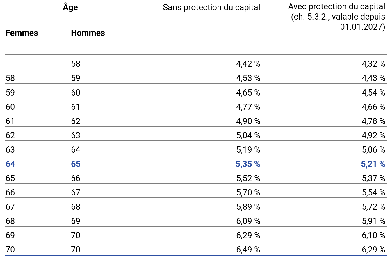 Le taux de conversion réglementaire de PROSPERITA est actuellement (état : 2026) de 5,35 % pour les hommes à l’âge de 65 ans et les femmes à l’âge de 64 ans. Si la retraite est anticipée ou différée, le taux de conversion est réduit ou augmenté en conséquence.